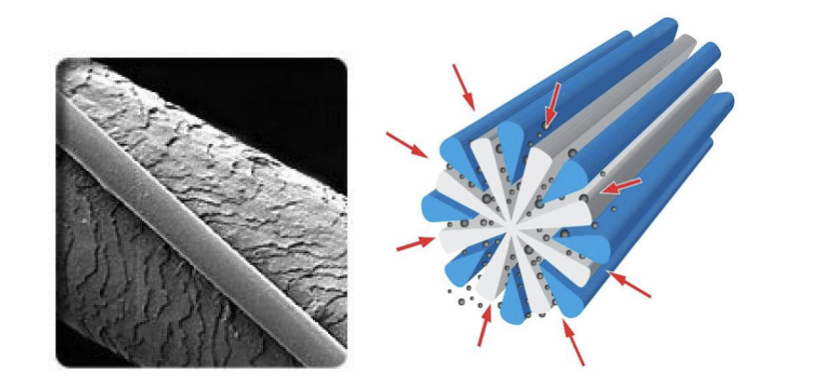 Jo smalkāka un blīvāka ir šķiedra, jo labāk tā noņem netīrumus un notur tos sevī. (1. attēlā — cilvēka mata un mikrošķiedras salīdzinājums. 2. attēlā — mikrošķiedras uzbūve.)